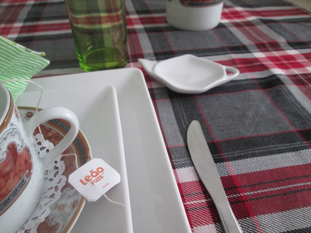 Escolhi o azul porque combinava com as pastilhas azuis. A antiga cortina